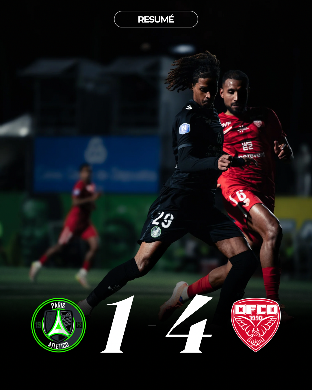 Le Paris 13 Atletico s’est lourdement incliné (1-4) face à Dijon, nouveau leader du National, vendredi lors de la 20e journée. C’est la 3e défaite de suite. Si le score est lourd, il ne reflète pas totalement la physionomie du match. Noa Donat s’était procuré la première situation mais il a perdu son duel face au gardien Paul Delacroix (5e). Dijon a rapidement mené 0-2 (12e et 14e) avec un 2e but marqué par notre ancien joueur Yanis Barka. Mais après la pause, avec trois changements (entrées d’Oumar Sidibé, Moussa Diarra, Ousmane Dramé) et un autre système (4-3-3), le P13A a bousculé Dijon et l’a acculé sur son but. Deux situations très litigieuses dans la surface auraient pu nous permettre d’obtenir un pénalty. Déstabilisée par ces décisions contraires, notre équipe commet une nouvelle erreur défensive sur le 3e but (72e). Si Ottman Dadoune réduit le score de la tête sur un centre de Moussa Diarra (76e), Dijon marque un 4e but en contre (1-4, 89e) alors que le P13A continuait à attaquer.